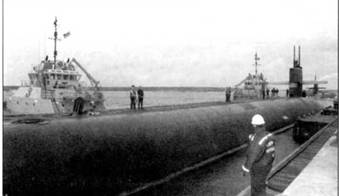 Буксиры ставят к причалу ракетный атомоход SSBN- 732 «Аляска», 15 августа 1998 г.