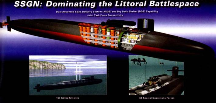 Рисунок SSGM-726 «Огайо», пуск крылатых ракет «То.могавк» из-под воды. Боекомплект лодки SSGN составляет 154 крылатых ракеты «Томогавк». В ходе конверсии лодка не только сменила оружие, но и приобрела возможность скрытно перевозить боевых пловцов (до 66 человек) и средства их доставки.