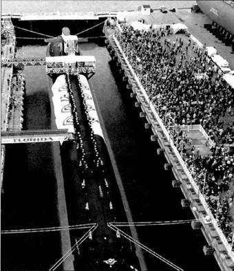 Спуск на воду атомного ракетоносца SSBN-728 «Флорида», 14 ноября 1981 г. Реактор запустили на лодке через год – 13 ноября 1982 г. Экипаж принял корабль только 21 февраля 1983 г. В боевой состав ВМС США лодка вошла 18 июня 1983 г.