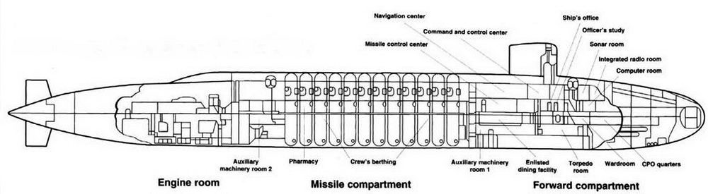 Пусковые шахты размещены в ракетном отсеке побортно в два ряда и пронумерованы в направлении от носа на корму (на правом борту нечетные номера, на левом – четные).