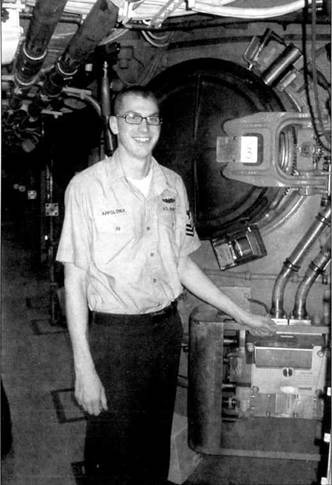 Моряк у крышки люка, предназначенного для технического обслуживании ракетной шахты.