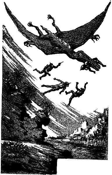 Уже теряя сознание от недостатка воздуха, я увидел гигантского ящера, напавшего на меня. Я потянулся к пистолету, однако новый удар свалил меня с ног и я покатился в пропасть. Ящер подхватил меня…