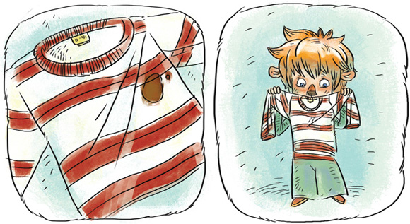 К новому путешествию надо подготовиться. Вынуть времяскок. И надеть любимую майку. Белую, с красными полосками. Ой! На ней рыжее пятно. Откуда оно взялось? Вспомнил. Вчера я полез на дерево и расцарапался, а когда дядя Кузя мазал мне руку йодом, я так вертелся, что йод пролился на майку. Он так щиплется! Да-а… с таким пятном путешествовать не очень-то приятно. Надо попробовать его отмыть. Ох и вредный этот йод. Мало того что щипучий, так ещё и не отстирывается.