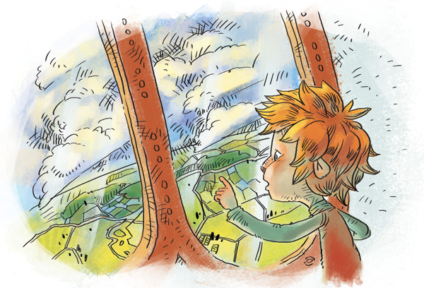 – Какая же красота внизу: лес зелёными пятнами, поля – жёлтыми крадратами, между ними полоски дорог и синие ленты рек! Эх, жалко нельзя узнать, где мы пролетаем!