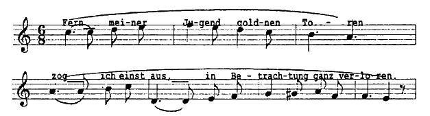 Sie ist mir ewig, ist mir immer Erb und Eigen, Ein und All [174]Они прозвучат невообразимо смело, торжествующе. Вот так я нежданно-негаданно очутился в «Зигфриде». Как после этого не поверить, что я доживу, выдержу до его окончания?» Иной пример — пример неполноценной музыкальной идеи — Вагнер приводит в другом письме Матильде Везендонк, написанном, когда Вагнер только что приступил к сочинению «Мейстерзингеров». Вагнер предусмотрел следующую мелодию для Вальтера: