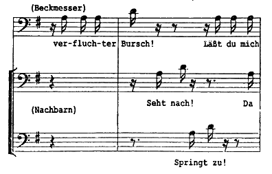 Наряду с главными героями необычайно четко охарактеризованы и второстепенные. Достаточно сравнить Погнера, доброго, благожелательного отца, с Даландом, его предшественником из «Летучего голландца», традиционно условным представителем того же амплуа, чтобы понять, как далеко вперед продвинулся Вагнер в своем искусстве. И вторая любовная пара «Мейстерзингеров» удостоилась самой живой, индивидуальной характеристики — Давид и Магдалена. А если характерные типы «Мейстерзингеров» сравнить с персонажами «Кольца нибелунга», всякому станет ясно, сколь огромен контраст между ними. Мы уже указывали на то, что в «Кольце» злодеи, интриганы обделены музыкой — как и в «Лоэнгрине», «Тристане», «Парсифале» — и что это связано с самой «конституцией» этих произведений. В «Мейстерзингерах» любая фигура полнокровна, пропитана музыкой, и даже на Котнера, суховатого старшину гильдии, проливается яркий свет музыки, когда он зачитывает табулатуру — правила цеха мейстерзингеров. И Бекмессер, писарь, воплощенный враг искусства, любого чувства, — живая, оригинальная личность. Пародировать легче всего, и Бекмессер мог бы стать простой пародией. Но композитор ограничивает пародийность этого образа весьма сдержанными намеками. Поэтому серенада, которую исполняет Бекмессер, — это непревзойденный шедевр; несмотря на все пародийные частности, это великолепная мелодическая находка, благословенный ритм, из всего этого и вырастает чудесно задуманный финал второго действия. Раздраженный прямолинейной критикой Ганса Сакса, который, отмечая ошибки, знай себе бьет молотком по подошве башмака, Бекмессер вне себя от возмущения с трудом «продирается» сквозь последнюю строфу своей песни, и тут на него набрасывается с кулаками Давид, который, увидев своими зоркими глазами сидящую в окне переодетую Магдалену, решил, что ей-то и предназначалась серенада незадачливого писаря. Так и начинается славное побоище, где никому не ведомо, кто кого бьет и за что… А из «Мотива драки» вырастает фуга с мелодией серенады Бекмессера в качестве второй темы! Эта тема поднимается по терциям вверх, чтобы — ради этого и все нарастание! — приземлиться на фа-диез, единственной ноте, какую издает рожок ночного сторожа, который уже довелось услышать в предыдущей сцене. Этот фа-диез — сигнал ужаса: все немедленно разбегаются… А вместе с тем с него начинается поразительно прекрасная мелодия: прежде она звучала, когда Вальтер и Ева сидели в уединении под липой, и, кажется, все волшебство теплой летней ночи перешло в эту мелодию. Когда же ночной сторож выходит на сцену и, зевая, напевает свою песню, думая, должно быть, что услышанный им издалека шум просто-напросто пригрезился ему, а затем мелодия летней ночи, нарушаемая тихим отголоском отшумевшей драки, перебивается клочками бекмессеровской серенады, на звуках которых и опускается занавес, — это самый чудесный финал оперного акта, который когда-либо был написан.