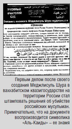 После первых успехов международной антитеррористической коалиции в Афганистане в 2001–2002 годах «Аль-Каида», до этого пользовавшаяся гостеприимством «Талибана» на афганской земле, стала искать новый плацдарм. Маджлисуль Шура стал наводить ваххабитские (или, если кто хочет так назвать, аль-каидовские) порядки в Чечне. Стали приниматься решения-приговоры в отношении российских мусульман на территории как Чечни, так и всей остальной России. Этим объясняются непонятные постороннему наблюдателю убийства имамов мечетей, потомков пророка Мухаммада в Чечне. Мы располагаем образцом такого решения.