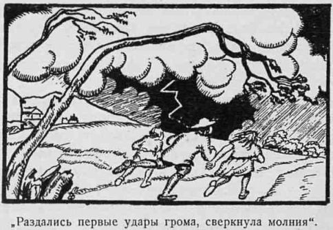 Мы быстро собрались и поспешили домой. Отец с сыновьями бросились вперед, а я и девочки шли сзади. Небо потемнело и заволоклось тяжелыми тучами. Ветер поднимал пыль, слепившую нам глаза. Раздались первые удары грома, сверкнула молния.