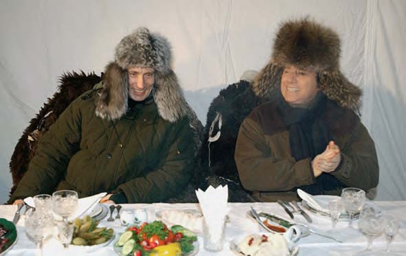 Всегда рад видеть Сильвио Берлускони: они оба надели теплые вещи, когда Путин пригласил своего друга пообедать на свежем воздухе в загородной резиденции невероятно морозным вечером