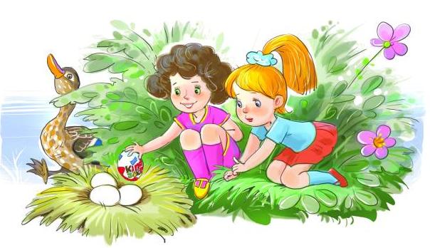 Как только утка стала высиживать утят, девочка Оля позвала девочку Элю, чтобы ей показать утку. А у девочки Эли в руках было шоколадное яйцо с киндер-сюрпризом. И Эля это яйцо подсунула в гнездо.