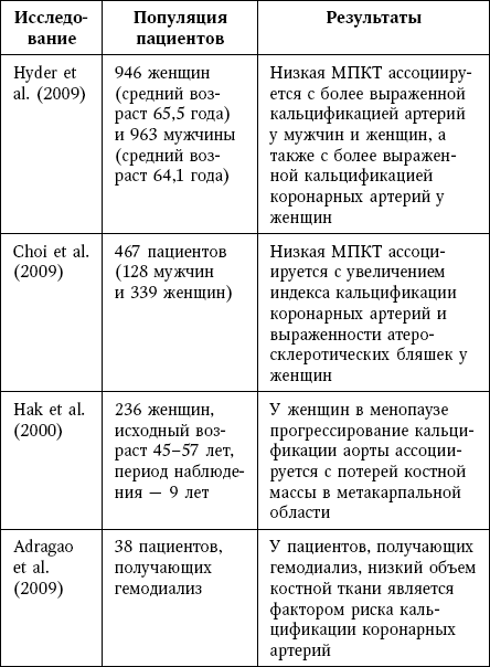 В другом исследовании, в котором выполнялось изучение коронарных артерий методом мультиспиральной компьютерной томографии, была установлена связь индекса кальцификации коронарных артерий и выраженности атеросклеротических бляшек с низкой МПК у женщин в пре– и постменопаузе; данная связь не зависела от возраста и сердечно-сосудистых факторов риска. В исследовании продолжительностью 9 лет, которое включало 236 женщин, потеря костной массы в период менопаузы была значимо выше у женщин с прогрессированием кальцификации аорты по сравнению с отсутствием прогрессирования.