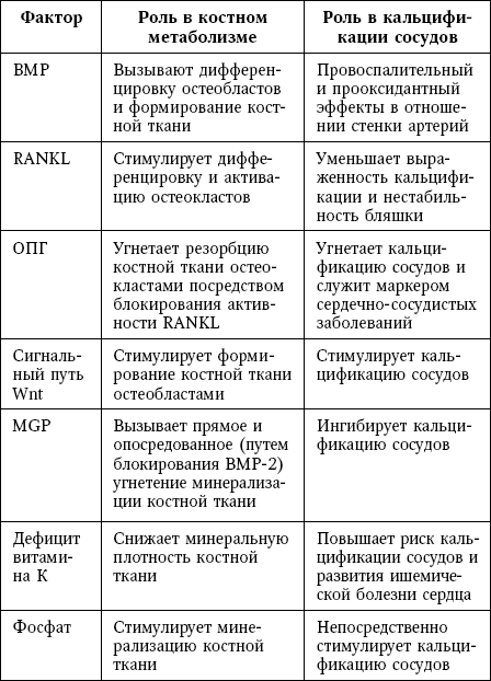 Факторы, участвующие в патогенезе как остеопороза, так и кальцификации сосудов, включают белки, гормоны, химические элементы, липиды и витамины (табл.).