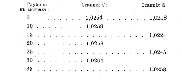 Сравнивая удельные веса воды на станции О, лежащей по западную сторону Югорского Шара и на станции S – по восточную, мы видим, что на поверхности в неглубоких слоях по западную сторону Югорского Шара вода имеет большую соленость, чем по восточную.
