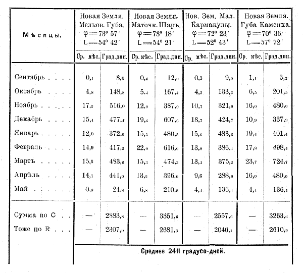 Средняя сумма для четырех пунктов на Новой Земле 2411 градусо-дней мороза по Реомюру.