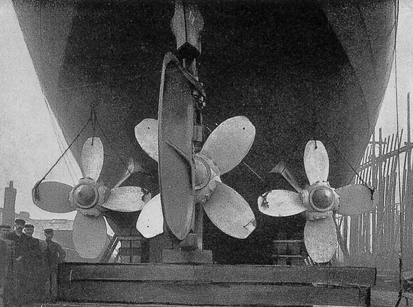 У ахтерштевня есть небольшая особенность, введенная по моей инициативе, а именно: передняя сторона ахтерштевня не представляет плоскости, нормальной к линии судна, а срезана на 45°. Выше оси винта срез идет в одну сторону, а ниже в другую и в таком направлении, что струя воды и лед, отбрасываемые лопастями винта, попадают на острый угол ахтерштевня. Задняя кромка переднего ахтерштевня срезана параллельно передней кромке заднего. Эта особенность уменьшает до некоторой степени сопротивление заднего ахтерштевня, а потому она даст полезные результаты, хотя прямым опытом трудно установить размер пользы.