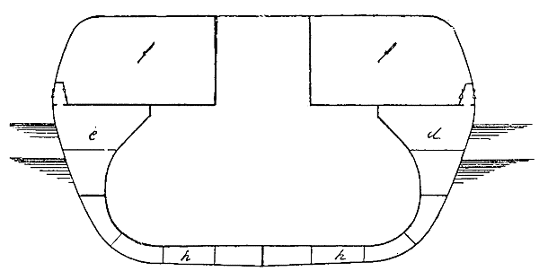 Наклон бортов подымается выше ватерлинии, и линия наибольшей ширины судна находится в носу и корме на 30 футов от дна, а на миделе на 27 футов.