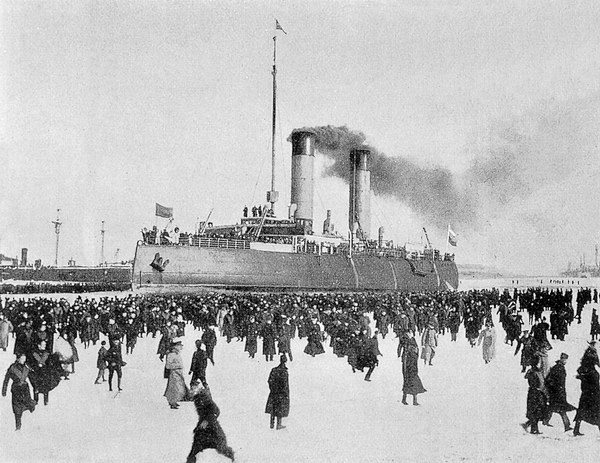 Подходя к Купеческим воротам, „Ермак“ сталь салютовать… Белые струйки дыма вылетали то с правого, то с левого борта. Тысячная толпа бежала по льду впереди и по бортам „Ермака“.
