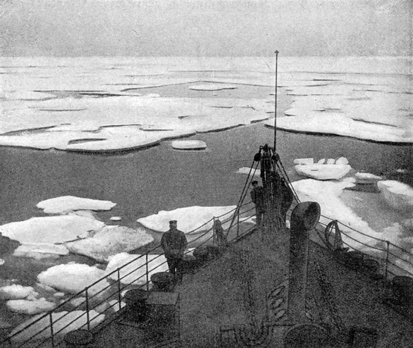 «По мере хода судна лед увеличивается, и поля становятся большего размера с меньшим количеством каналов. Ход держим малый, около 6 узлов, но и при этом ходе удары очень сильные. Дело в том, что малый ход все же дает большую скорость. Велел малым ходом считать 40 оборотов машин, потом уменьшил еще, приказав боковым машинам на малом ходу держать 30 оборотов. При таких условиях ход все-таки достаточно велик. Трюмный машинист все время осматривает носовое отделение; он говорит, что огромная разница с тем, что было прежде, что корпус не так дрожит. В следующий раз Перский доложил, что в некоторых заклепках показалась небольшая течь. Туда пошел Гольстон и по выходе сказал, что это ровно ничего не значит и не может препятствовать дальнейшему плаванию. К 6 часам лед стал гораздо гуще, а в 7 часов мы приспустили марс и с марса выбирали путь, причем казалось, что впереди прохода совсем нет. Тем не менее, двигались вперед, идя то щелями, то проламываясь напрямик. В 7 часов вечера я, пообедав, вышел наверх и подсменил командира. Прошли несколько небольших торосов, которые легко развалились, но местами встречаем такие льдины, при ударе о которые обнаруживаются сильные толчки на корпус судна. В 8 часов, идя по трещине средним ходом, увидели впереди перешеек, состоящий из тороса. Уменьшили ход до малого, но судно не успело потерять забранного хода и ударилось со скоростью около 5 узлов. Удар пришелся в правую скулу; нос отбросило влево, и судно от удара сразу остановилось, хотя продолжало понемногу раздвигать льдины. Командир с Перским пошел в носовое отделение, и когда приблизился к новой большой горловине, то увидел, что из нее выступает вода. Они вдвоем бросились закрывать горловину, что и удалось сделать. Внизу закричали, что вода, прибывает, почему дал задний ход, подошел к левой льдине и ошвартовался. Всего от полудня до остановки пройдено льдами 32 мили».