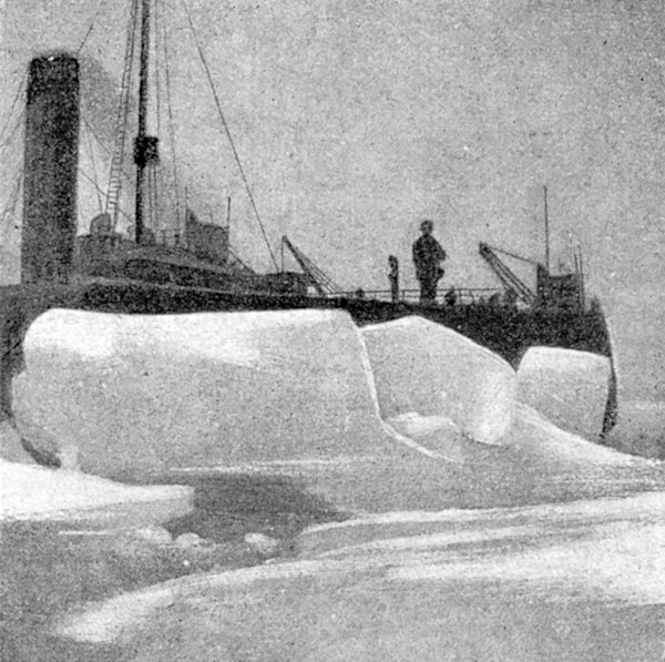 В 10 часов вечера, передав на «Вирго» почту и несколько бочек цемента для постройки знака вековой марки в бухте Адвент, мы пошли далее на север, и в 11 часов начали встречаться более крупные льдины, почему повернули на NNE. В 12 часов число льдин увеличилось; сделал сигнал «Вирго», чтобы он остановился, после чего легли на истинный N. В дневнике я записал следующее: