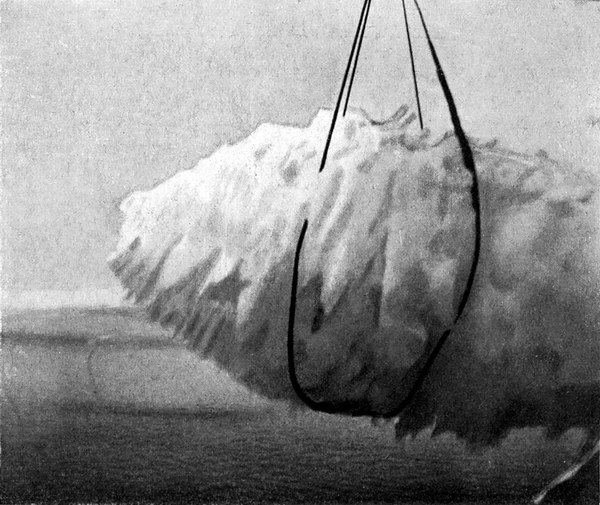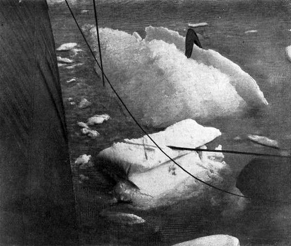 В 11 1/2 часов подошли к торосу, загромождавшему путь. Прикоснулись к нему, идя лишь узла 3–4. Торос тотчас же развалился. Одни глыбы падали вниз, другие из-под низа всплывали наверх. Картина поразительная! Вся вода наполнилась обломками тороса. Если бы такую картину сбоку снять кинематографом, то это дало бы некоторое представление об удивительно эффектных моментах, которые так часто встречаются при ломке полярного льда.