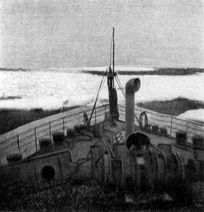 29 июля (10 августа). В 6 часов утра пошли и, пройдя милю, встретили перешеек в две длины судна, образовавшийся от сжатия двух больших ледяных полей. С судна нельзя было заметить, где находится место соприкосновения двух льдин. Очевидно, оно шло зигзагами и нагромождения на нем смешивались с другими нагромождениями. Перешеек состоит из толстых льдин. Пар был слабый и лишь в трех котлах. Велел поднять пар. В 8 3/4 начали пробиваться легкими ударами. Ветер Е–5 мешает до некоторой степени маневрировать. Боялся с пробитым судном ударять с большого хода. Удары наносились с хода до 7 узлов, но на корпусе они не отзывались. Лед ломался, и ветром обломки выносило назад. Когда пробили четверть перешейка, то он дал трещину. Мы уперлись в лед и продолжали действовать машинами полным ходом. Льдины потихоньку тронулись и через несколько минут раздвинулись настолько, что ледокол пошел вперед. Каждая из льдин была размером около 1 мили, и обе они находились в некоторой степени сжатия; тем не менее раздвинулись.