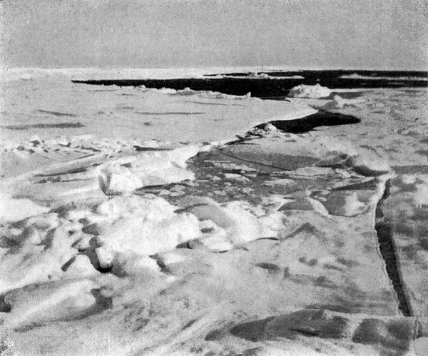 Лед целый день находился в движении и переформировании. Торос, о который мы ударились 25 июля (6 августа), зажатый в то время между двух больших льдин, теперь уплыл от нас на полмили по направлению щели.