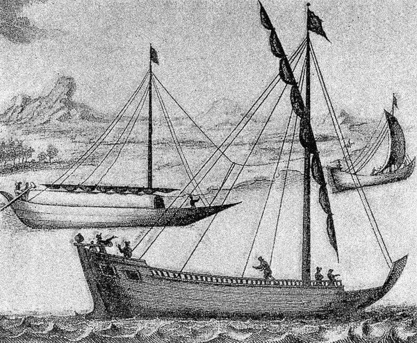 Парусные суда в Сибири. На переднем плане досчаник. Из книги «Северная и Восточная Тартария» Николая Витзена, 1692 г.
