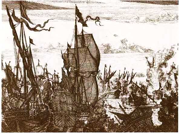 Бой флибустьерской и испанской флотилий. Гравюра из книги Эксквемелина. 1678 г.