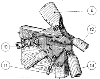 1. Узлы крепления шнуровых амортизаторов 2. Предохранитель от запрокидывания лыжи в полете 3. Амортизатор 4. Передний узел крепления шнурового амортизатора к фюзеляжу 5. Задний узел крепления шнурового амортизатора 6. Кабан главной лыжи 7. Сосновый брусок трапецтвиднсй фермы 8. Средние усиливающие сосновые бруски 9. Ясеневый полоз 10. Фанерное основание полоза 11. Оковка из листового аллюминия 12. Стрингеры 13. Фанерные шпангоуты 14. Серьга крепления амортизатора 15. Амортизатор 16. Узел крепления амортизатора к лыже 17. Предохранительный трос 18. Упор, ограничивающий поворот лыжи 19. Кабанчик хвостовой лыжи
