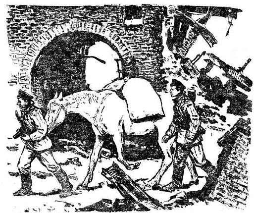 Их внимание привлекло не то, что пакгауз горел, – мало ли они за войну видывали пожаров! Да и горел-то он едва-едва, почти без пламени, лишь сочился жидковатый дымок из маленьких окошек под крышей, из распахнутых широких дверей. Их взволновало другое: весь пакгауз заполнен мешками.; А в мешках – мука! Видимо, гитлеровцы не ожидали, что им придётся так быстро оставить место, где находится склад, и, не успев вывезти муку, подожгли его. Мука уже высыпалась из некоторых прогоревших мешков – великолепная, белая. Она поддавалась огню медленно, словно нехотя – скорее, тлела, чем горела, и лишь кое-где временами занималась коптящим пламенем…
