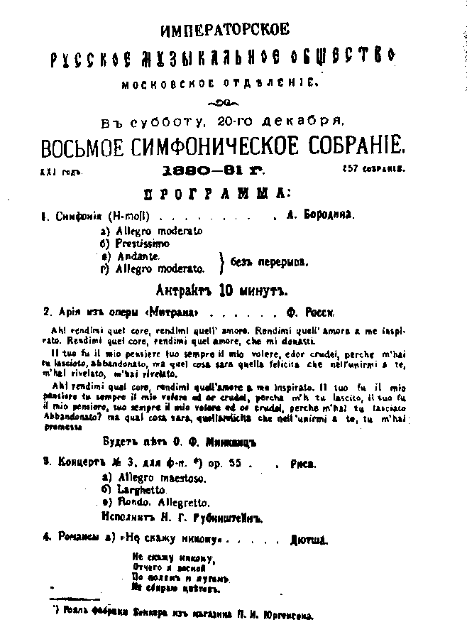 Программа концерта, на котором впервые в Москве в присутствии А. П. Бородина была исполнена его Вторая симфония.