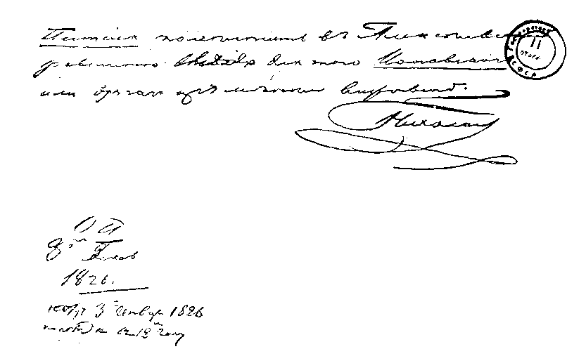 Записка Николая I коменданту Петропавловской крепости с приказом о водворении П. И. Пестеля в Алексеевский равелин.