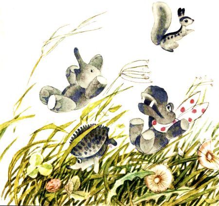 А Кузя спрыгнул ловко, как кузнечик, с ходуль, снял папины пижамные штаны и закинул злодейский пистолет с горы в лес. Он развязал сестру свою Васю, нарезал острым ножиком из разбойниковых штанов много красных в жёлтых цветочках галстуков и все их роздал зверям.