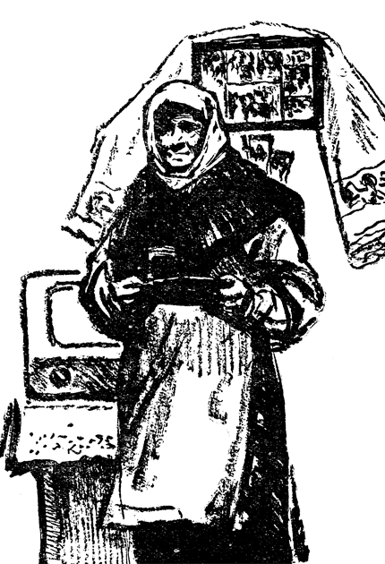 Мать идет с огорода. Платок на ней чистый, белый, как в воскресный день, — для нее и впрямь теперь всегда воскресенье. В руках несет укроп, морковь, пучочек петрушки, свежезеленой, росистой.