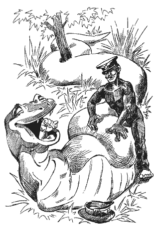 Хотел его Краснобаев остановить, но не успел. Споткнулся об корягу и чуть не упал. А Бочкин подбежал к змее и уже хотел взобраться на нее, как прямо перед его лицом возникла огромная зубастая пасть. Сверкнули два злобных глаза, изучающе посмотрели на Бочкина. Генерал так и застыл от страха. А потом его круглое тело обвили могучие кольца и начали с силой сжимать.