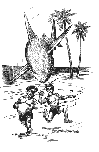 Бегали, бегали Краснобаев и Бочкин по всему острову, по лесу, по берегу, даже на гору пытались подняться, а все от акулы избавиться не могут. Летит она за ними, вот-вот догонит. И хотя нагрелась вся, бока об воздух натерла во время полета, чуть не красная, как раскаленный гвоздь, а все одно летит. Такая вот им уникальная акула попалась. Или просто упрямая? Бывают такие упрямые акулы, что с ними не делай, все одно не отстанут.