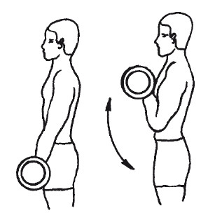3. Возьми штангу или гантели. Стоя, опусти руки со штангой (гантелями) вниз. На счет «раз» медленно согни руки и поднеси штангу (гантели) к плечам. На счет «два» также медленно верни их в исходное положение. Повтори упражнение 10 раз, сделай перерыв в 2–3 минуты и повтори еще 10 раз (рис. 7).