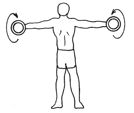 4. Ноги на ширине плеч. Руки с гантелями разведи в стороны ладонями вверх. Совершай 10–15 вращательные движения кистями вперед. Отдохни немного и сделай столько же вращений кистями назад. Вращения выполняй медленно (рис. 8).