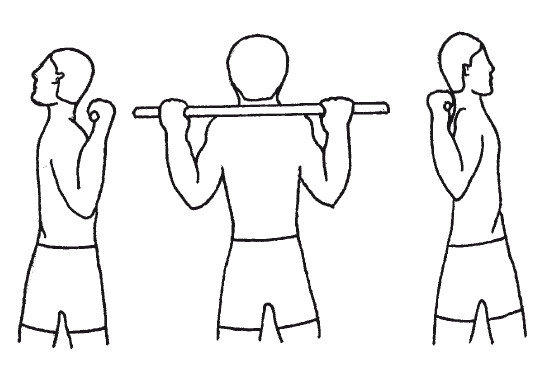 1. Возьми палку средней длины и на вдох подними ее над головой. При этом ноги должны быть разведены на ширину плеч. Опусти палку на плечи (выдох) и снова подними ее над головой (вдох). И так до 10 раз.