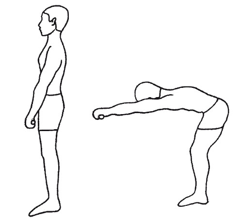 3. Опусти палку с прямыми руками вниз. Ноги на ширине плеч. Сделай вдох и на счет «раз» наклонись вперед. При этом руки подними вверх, как можно выше. Спина же должна оставаться прямой. На счет «два» быстро выпрямись в исходное положение. Повтори 10 раз (рис. 13, позиция Б).