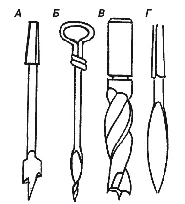 Рис. 18. Виды сверл: А – перовое; Б – простой бурав; В – винтовое центровое;