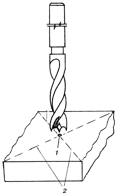 Рис. 19. Разметка точки сверления:1 – углубление, сделанное при помощи шила; 2 – взаимно пересекающиеся под прямым углом линии