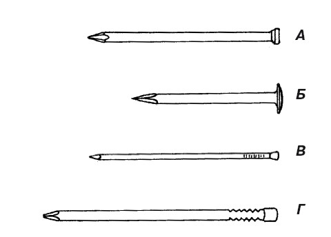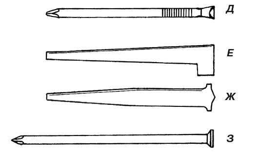 Рис. 20. Гвозди, используемые при различных видах работ: А – круглый гвоздь; Б – с выпуклой шляпкой; В – напольный гвоздь; Г – овальный гвоздь; Д – гвоздь без шляпки;Е – панельный гвоздь; Ж – штукатурный гвоздь; З – настенный гвоздь