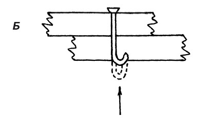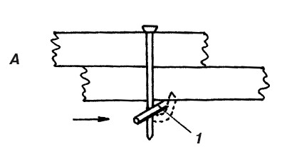 Рис. 22. Последовательность загиба вышедшего наружу конца гвоздя: А – загиб конца гвоздя с подкладыванием прутка;Б – утапливание загнутого конца в доску; 1 – обрезок прутка