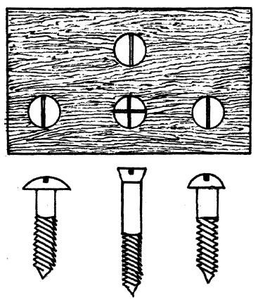 Шуруп внешне похож на гвоздь, только вот стержень толще и на нем есть винтовая нарезка. А на головке шурупа имеется прямая или крестовидная прорезь для отвертки (рис. 24). Как и гвозди, шурупы бывают разными по размерам и форме головки.