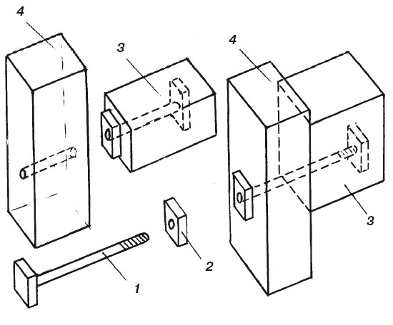 Рис. 25. Пример соединения на длинных болтах:1 – корпус болта; 2 – гайка; 3 – перекладина стола; 4 – ножка стола