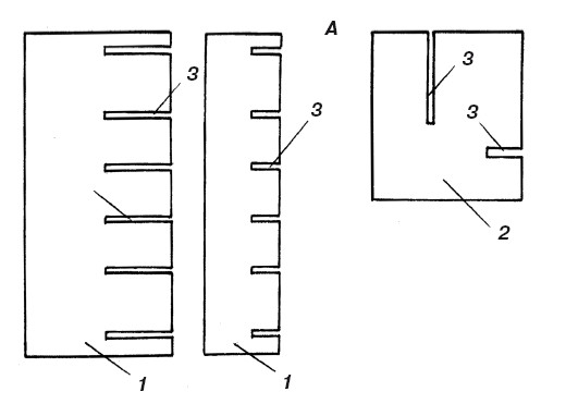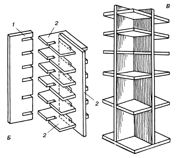 Рис. 26. Стеллаж без гвоздей: А – изготовление опорных досок и полок; Б – сборка досок и полок; В – готовый стеллаж; 1 – опорные доски; 2 – полки; 3 – врезки вполдерева