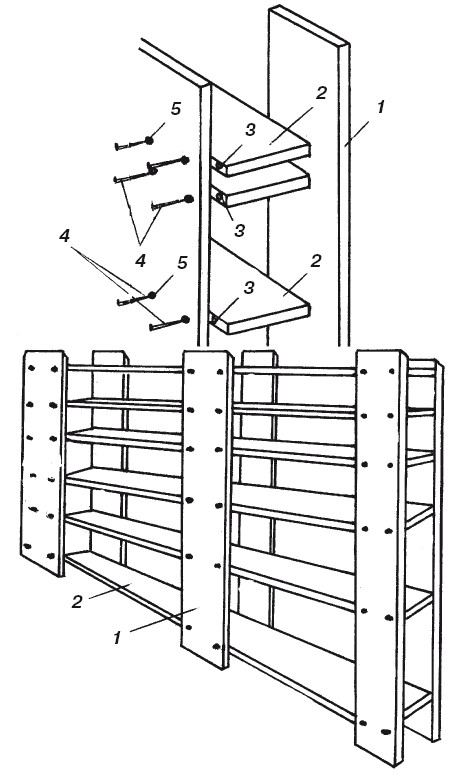 Рис. 27. Стеллаж на шурупах:1 – доски-стойки; 2 – полки; 3 – отверстия, просверленные под шурупы (их диаметр на 2 мм меньше диаметра резьбы шурупов); 4 – длинные шурупы; 5 – входные отверстия для шурупов (их диаметр на 1–2 мм больше диаметра шурупов)