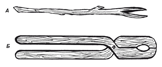 Рис. 42. Приспособления для ловли раков: А – палка с расщепом; Б – клещи