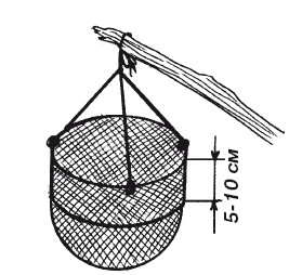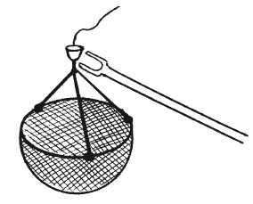 Удобно ловить раков специальными сетками – так называемые "рачевнями" (рис. 43). Рачевня привязывается к 3–4 шнурам одинаковой длины, которые соединяют общим узлом с более прочным шнуром, используемым для подъема рачевни. К сетке привязывают приманку, после чего рачевню опускают на дно. Шнур для вытаскивания рачевни закрепляют на шесте, воткнутом в берег. Как только рак наткнется на приманку и вцепится в нее клешнями, рачевню поднимают из воды. При этом рак не может никуда деться, так как запутывается в сети.